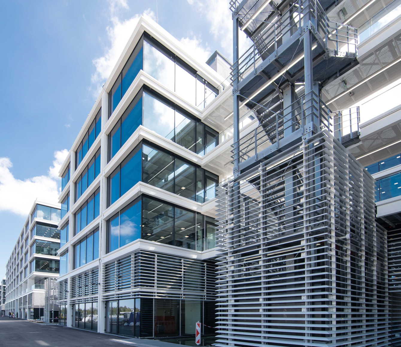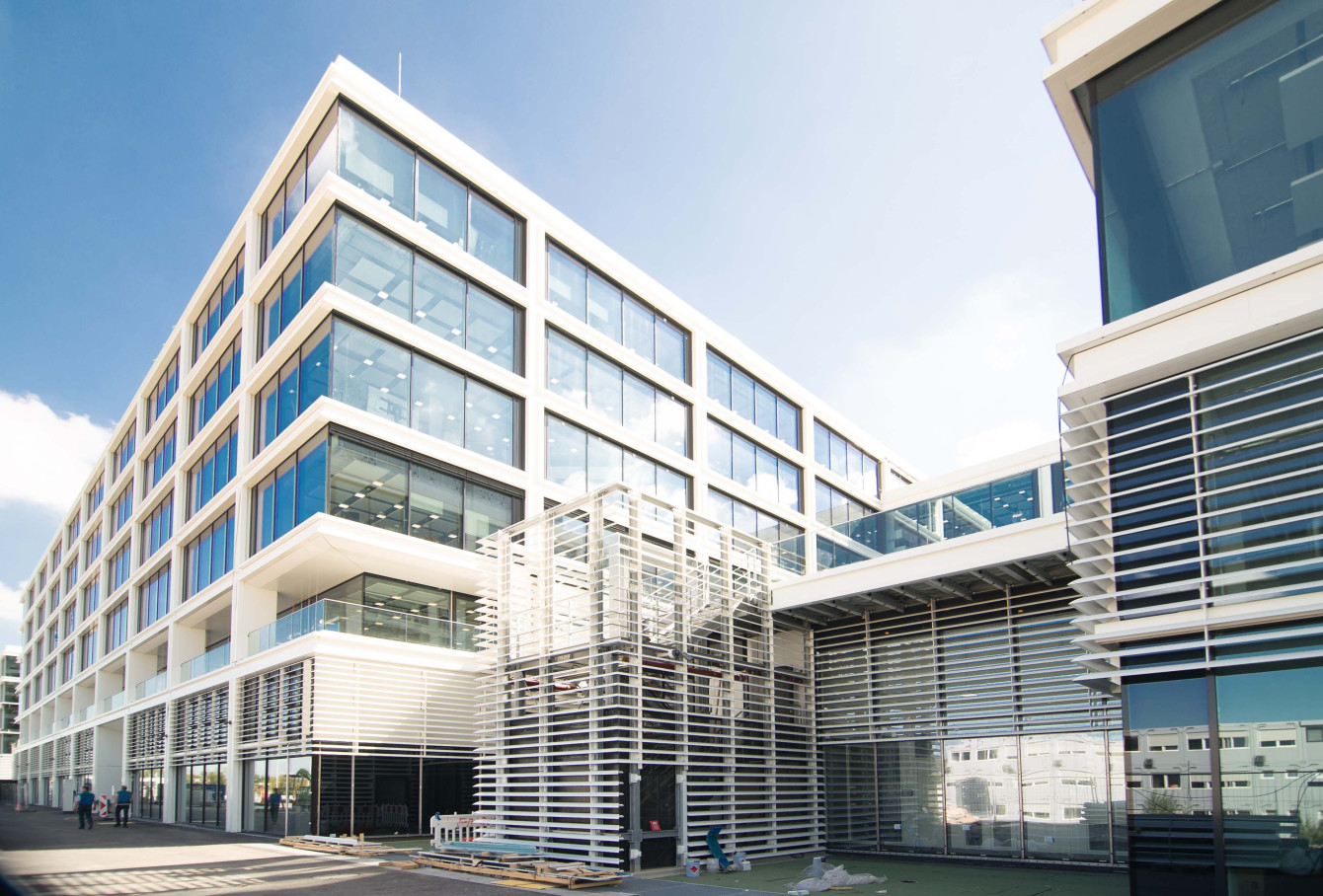 Ohne IT- und Kommunikationstechnik ist Smart Building Technologie nicht denkbar. Über 56 Verteilerstandorte in beiden Gebäudekomplexen sind über redundante LWL-Anbindungen untereinander und mit den Netzwerkzentralen verbunden. Neben der flächendeckenden WLAN-Versorgung oder der Vernetzung sämtlicher Steuerungsanlagen, z. B. für MSR-Technik, Jalousien- und Lichtanlagen spielt dies besonders bei Komponenten der Sicherheitstechnik eine große Rolle. So geht die Installation von Zutrittskontroll-, Zeiterfassungs- oder Gefahrenmeldesystemen Hand in Hand mit deren Vernetzung.