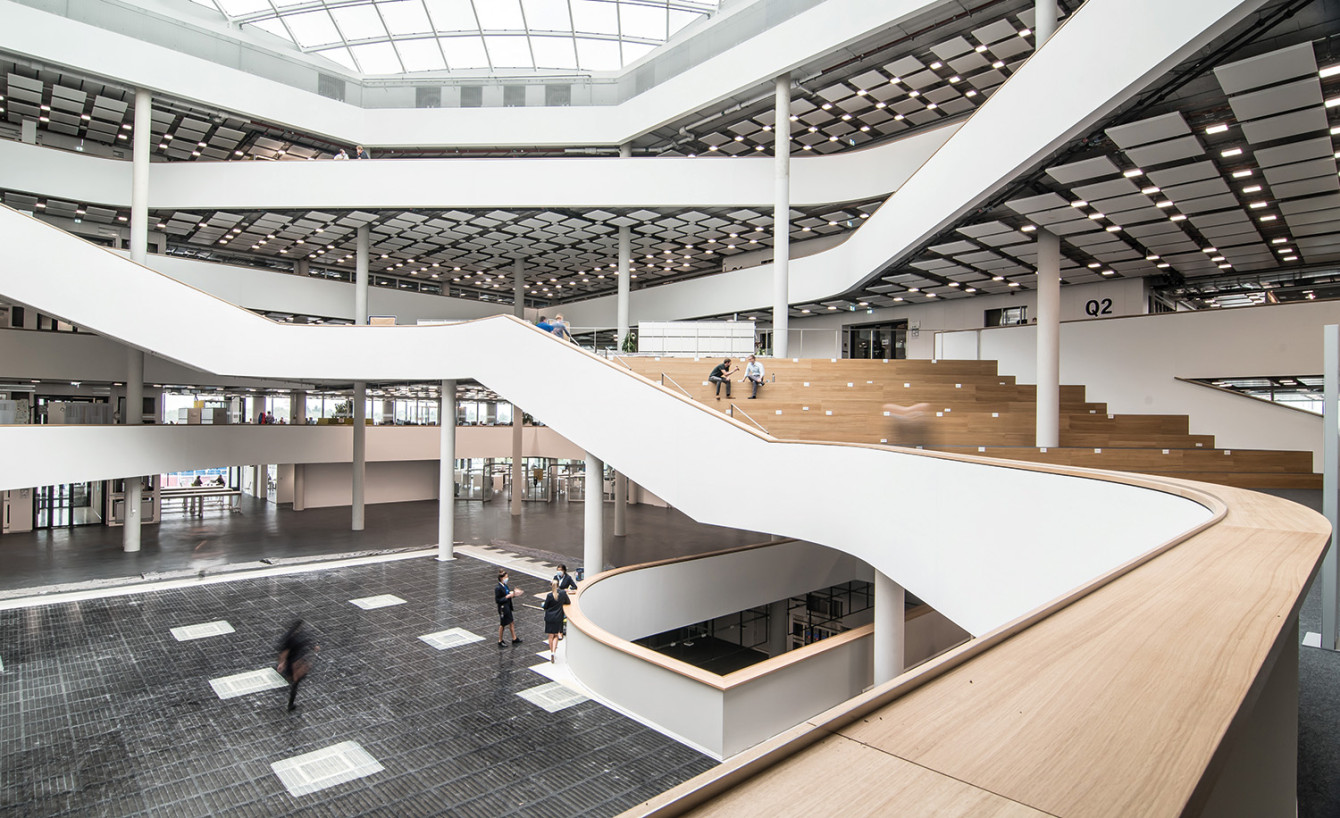 Sehr gut nachvollziehbar ist das Smart-Building-Prinzip anhand der Beleuchtungssteuerung. Hierzu wird das offene Raumkonzept auf den sechs Ebenen ähnlich einem Raster in über 1.400 virtuelle Räume aufgeteilt. Steuerbar ist die Lichtsituation in solchen Räumen über eine Smartphone-App. Mit Hilfe von sogenannten Beacons wird der Aufenthalt in einem Bereich erkannt, und Nutzer haben die Möglichkeit, die Lichtsituation an ihre Bedürfnisse anzupassen oder gespeicherte Szenarien aufzurufen. Dadurch wird die Beleuchtung von unnötig großen Bereichen vermieden. Die technische Umsetzung dieser Lösung erfolgt über eine Kombination aus DALI-Lichtsteuerung und WAGO-Controllern. Letztere übernehmen die Ansteuerung der Leuchten in den virtuellen Räumen. Eine Herausforderung hierbei ist die Anpassung der Controller-Software, um die Steuerung letztlich mit der Smartphone-App zu übernehmen.