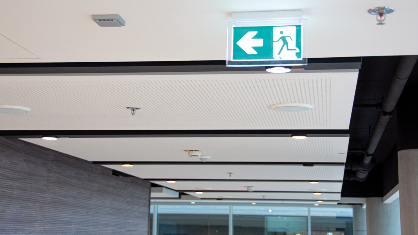 Die allgegenwärtige Kombination aus (Not-)Beleuchtung, Brandmeldetechnik, Präsenzmeldern, Lautsprecher- und Sprinkleranlage.