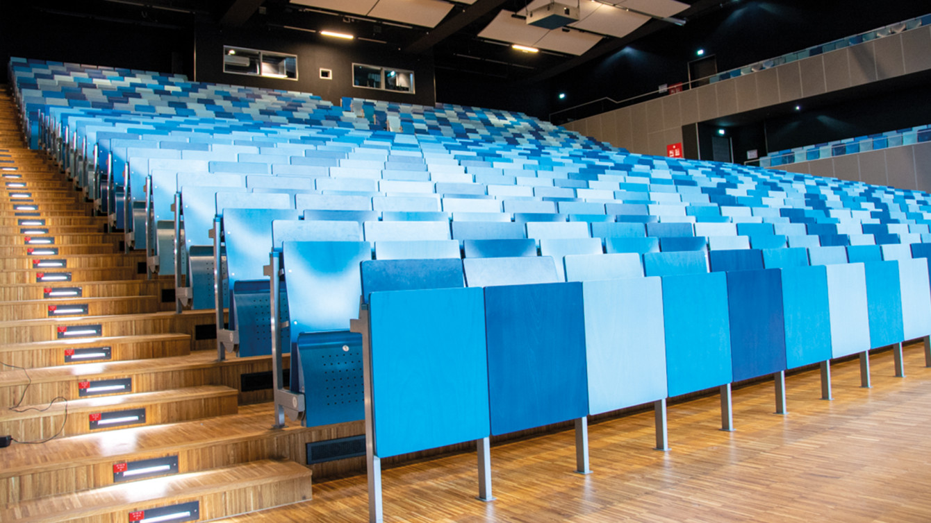 Das Audimax mit Teilen der Beleuchtung. Die Brandmeldetechnik wurde nahezu unsichtbar realisiert.