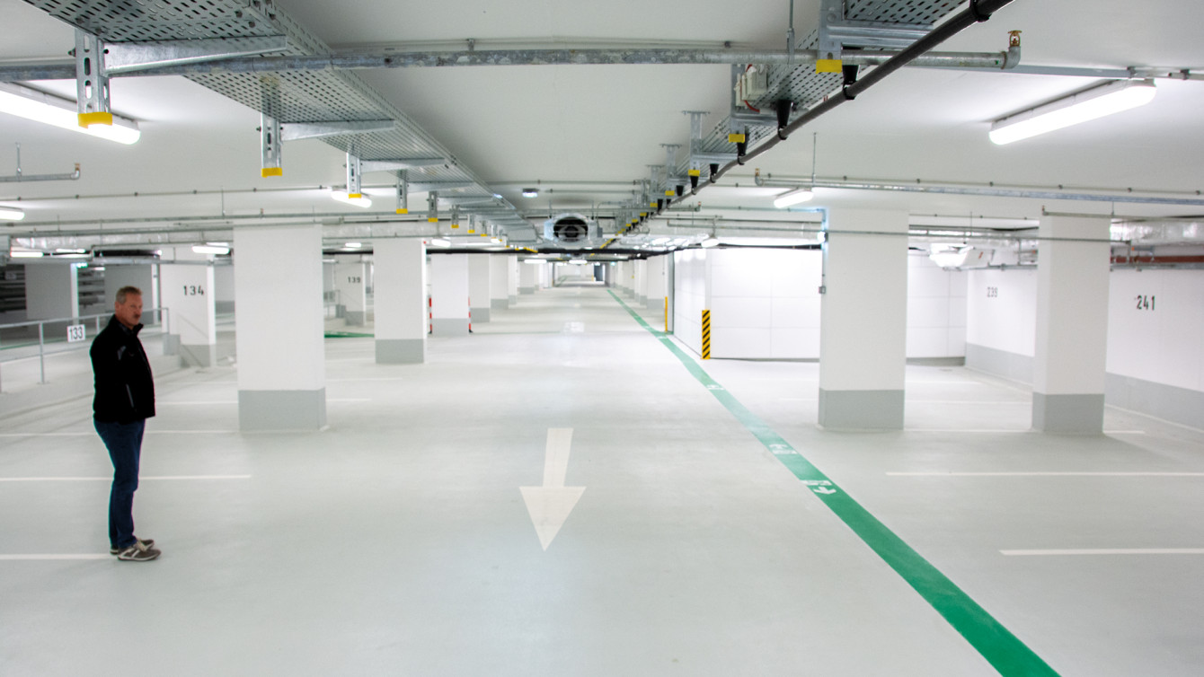 Ein Deck der Tiefgarage mit Kabelverlegesystemen, Beleuchtung und Gaswarnanlage.