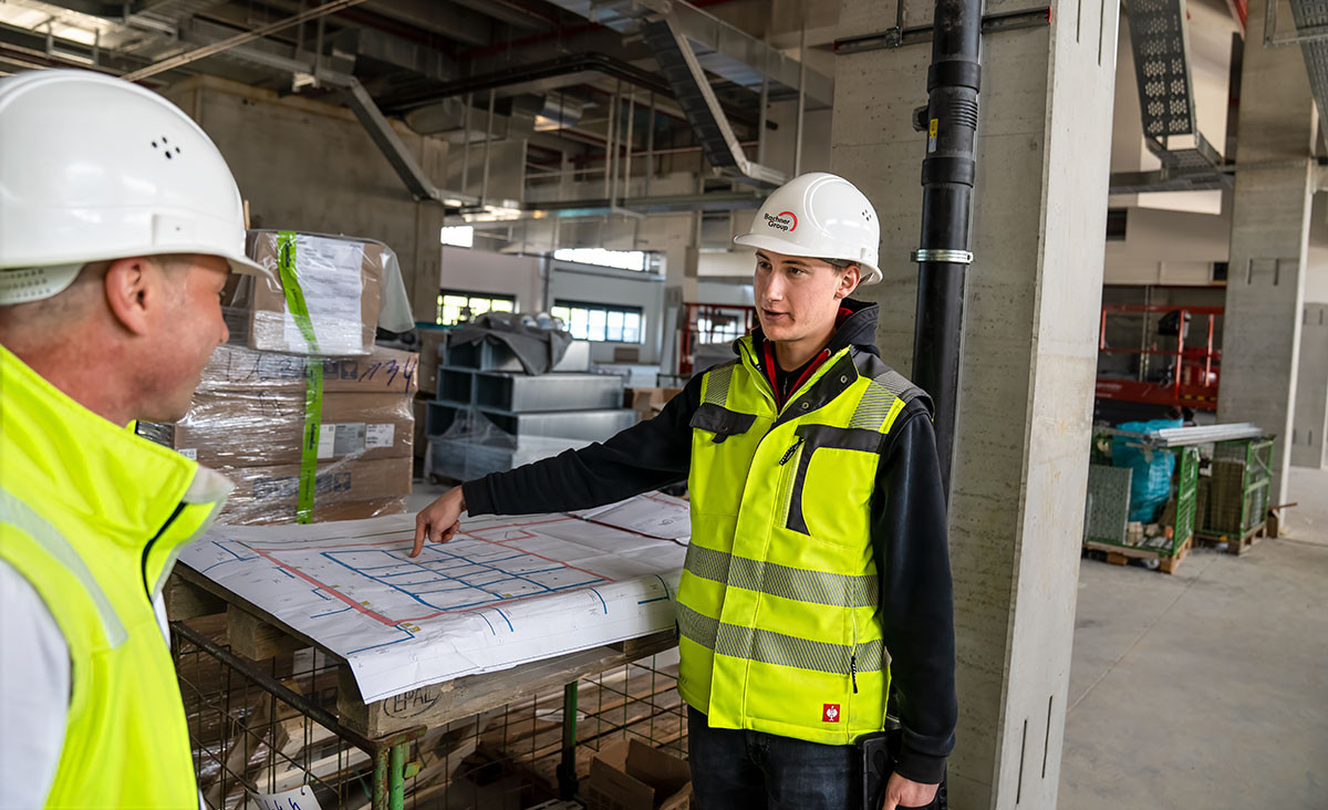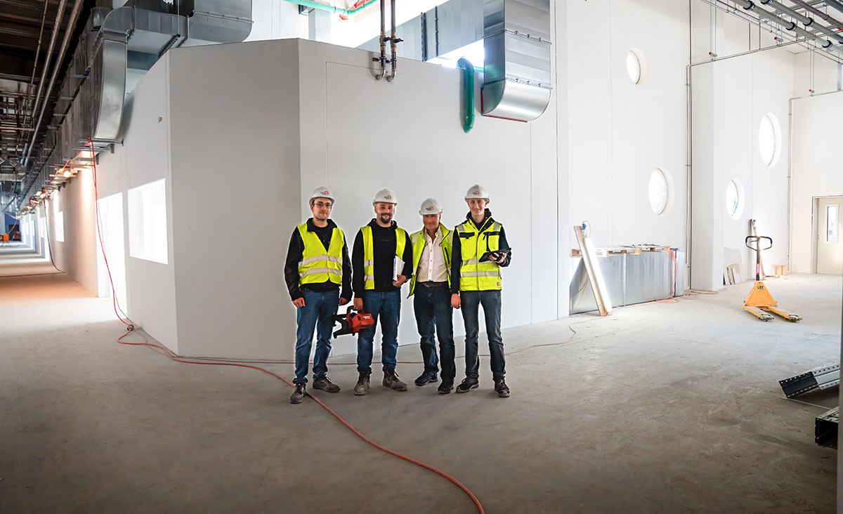 „Eine Besonderheit des Projekts sind außerdem die Reinräume“, erklärt Bachner-Bauleiter Alexander Herrmann. Reinräume werden für die Herstellung von Produkten benötigt, die ein hohes Maß an Sauberkeit erfordern, z. B. bei Medizinprodukten, Halbleitern oder Nanotechnologie. Damit sie dieses Maß an Sauberkeit erreichen können, verfügen Reinräume über eine HEPA-Filtration, um Partikel aus der Luft zu entfernen. „Nicht jedes Gebäude verfügt über solche Reinräume – daher ist das schon etwas Besonderes“, sagt Herrmann. „Für uns bedeutet das beispielsweise, dass wir spezielle Reinraumleuchten in diesen Bereichen verwenden müssen.“