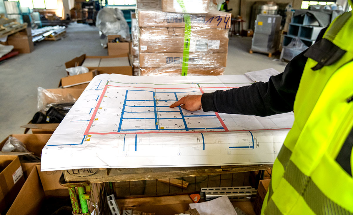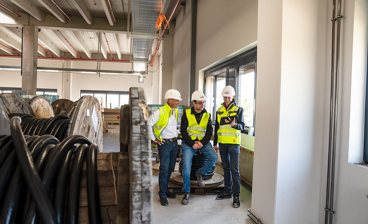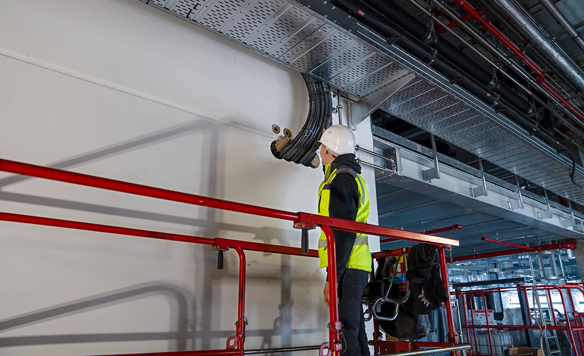 Die ONE SCHOTT FACTORY hatte eine weitere Anforderung: Das neue Gebäude soll auf Mittelspannungseben an den Bestandsbau von Werk 2 angeschlossen werden. „Damit das reibungslos funktioniert, müssen wir immer im Blick haben, wie sich diese Verbindung auf den Bestandsbau auswirkt“, sagt Harald Schiekofer, unser Projektleiter vor Ort. „Das heißt in diesem Fall, dass wir die Kapazitäten des Bestandsbaus erweitern müssen, z. B. bei der Brandmeldeanlage.“ Produktionsflächen und Hauptflure in der ONE SCHOTT FACTORY sind außerdem sehr dicht installiert. Eine intensive Abstimmung zwischen uns und den Gewerken HLSK, technische Gase und Feuerlöschanlagen ist daher unerlässlich.