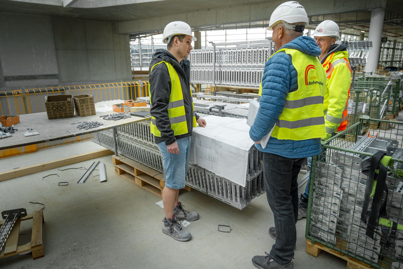 The tray construction project is progressing since April 2023 and it is supervised by two on-site project managers, Terence Woll and Simon Treffler. We have a comprehensive contract and are responsible for planning, execution, possible adjustments and the final handover. There are plenty of trays and troughs to be laid on six floors: In total, around 50 kilometers will be needed by the expected end of the project in September 2024.